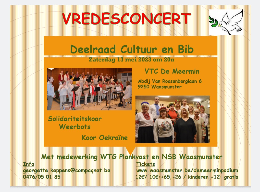 "VREDESCONCERT met Solidariteitskoor Weerbots (Waasmunster), WTG Plankvast (Waasmunster) en koor Oekraïne (Lokeren). Mmv NSB Waasmunster